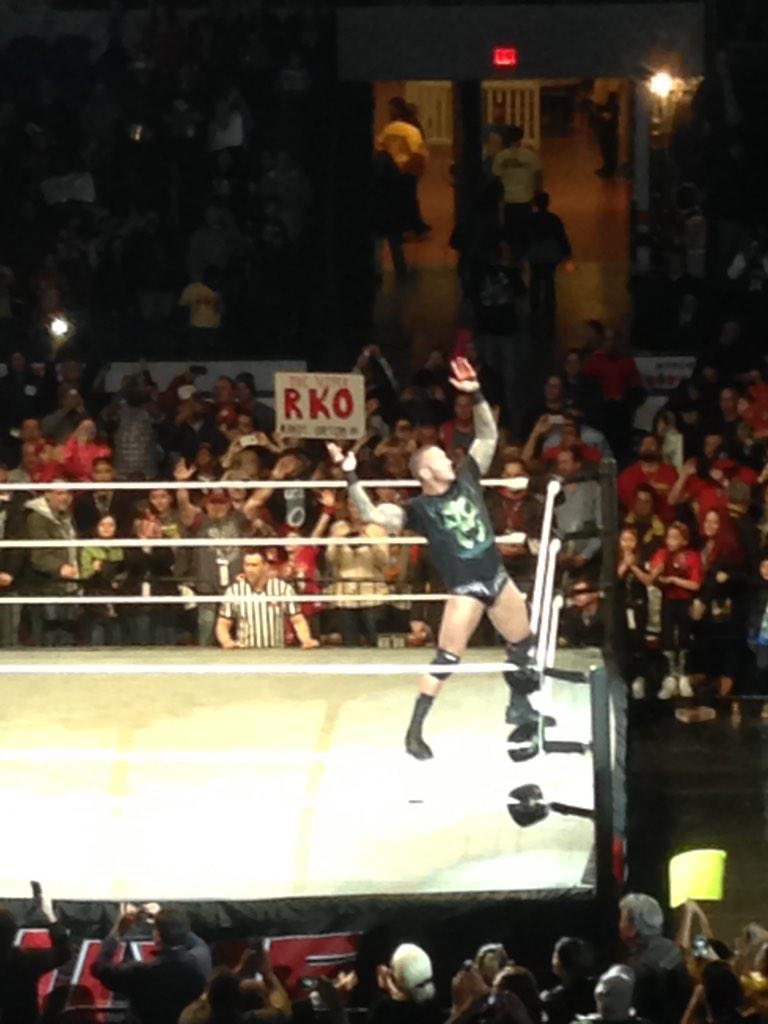 Orton recebeu o maior pop da noite. Eis uma foto e um comentário publicado por um fã no twitter: Randy Orton is not hurt, it was a work for the live crowd #RKOOuttaNowhere Cena wins with Randy's help! #WWELI
